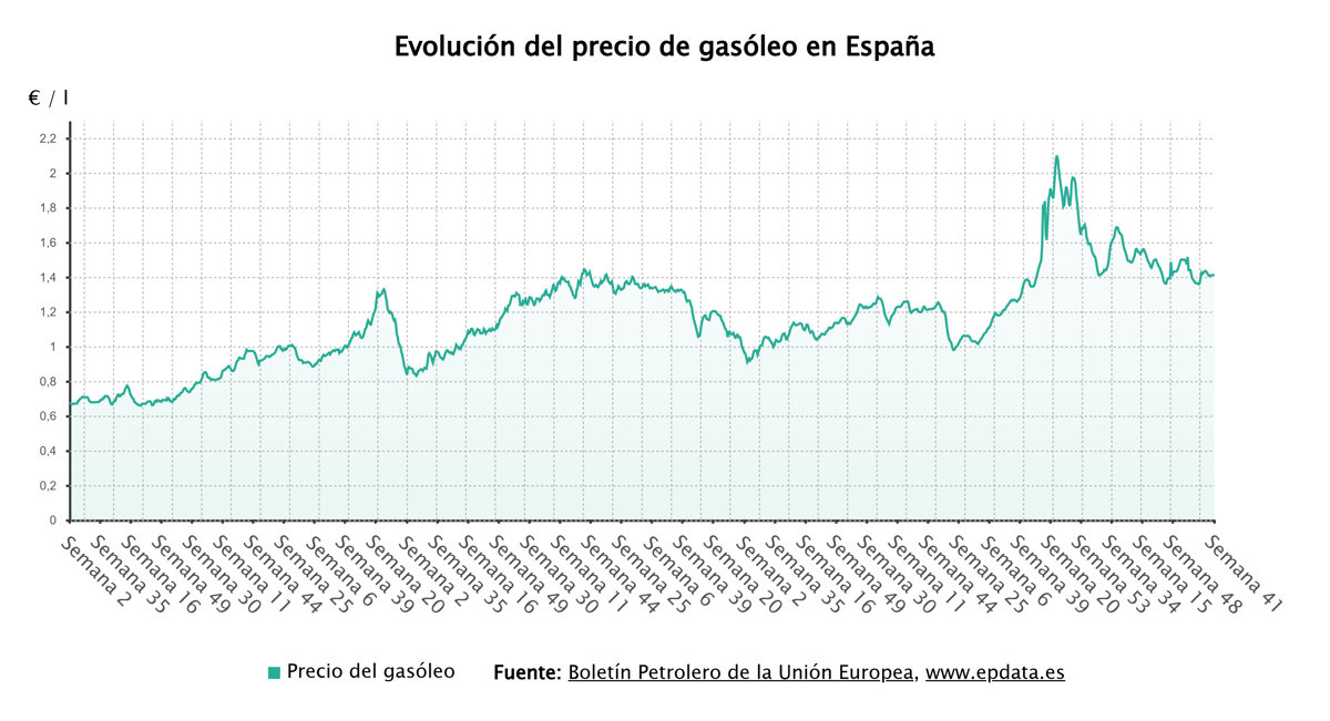 En concreto, el precio medio del litro de diésel se ha situado en los 1,412 euros esta semana, tras una subida del 0,07% con respecto a la pasada semana, según datos del Boletín Petrolero de la UE recogidos por Europa Press.