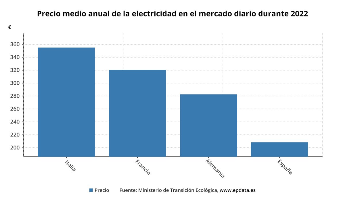 El precio medio anual en el mercado diario en España fue inferior en 2022 al registrado en Francia, Alemania e Italia, según ha informado este lunes la vicepresidenta tercera y ministra para la Transición Ecológica, Teresa Ribera, durante el balance del Plan +SE relativo a medidas energéticas.