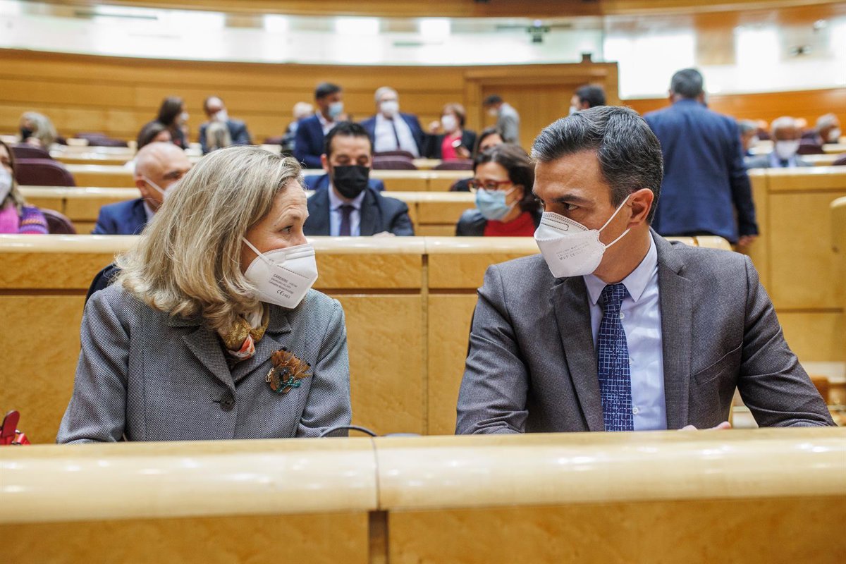 Archivo - La vicepresidenta primera del Gobierno y ministra de Asuntos Económicos y Transformación Digital, Nadia Calviño y el presidente del Gobierno, Pedro Sánchez, en un pleno en el Senado, a 15 de febrero de 2022, en Madrid (España). - Alejandro Martínez Vélez - Europa Press - Archivo