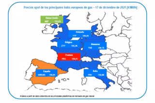 El último boletín de precios de mercados elaborado por la asociación señala que entre 4 y el 17 de diciembre se produjo una subida media del 16,10% en los precios de los 'hubs' europeos, hasta promediar los 106,10 euros por megavatio hora (MWh), es decir, 14,67 euros más que en el periodo anterior.