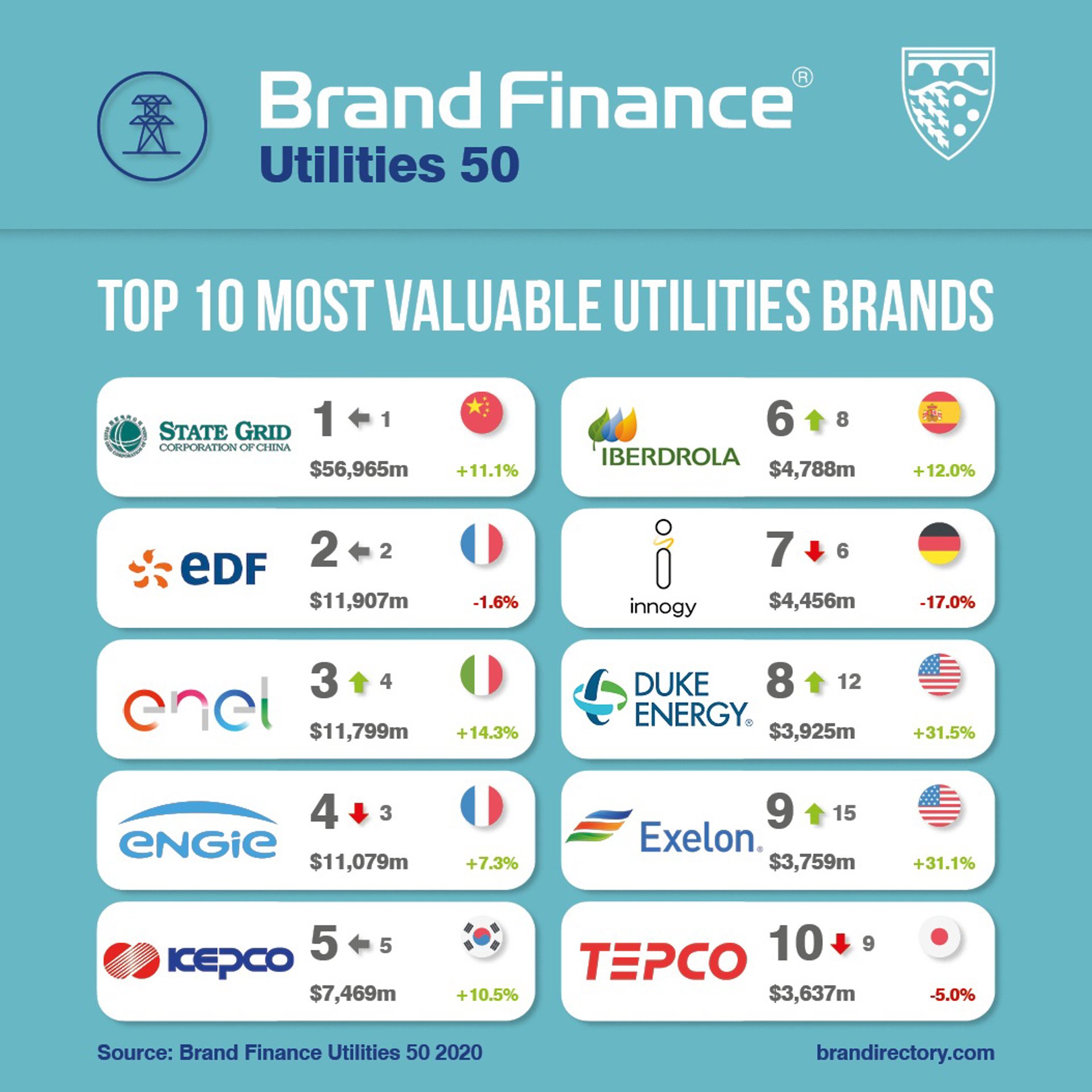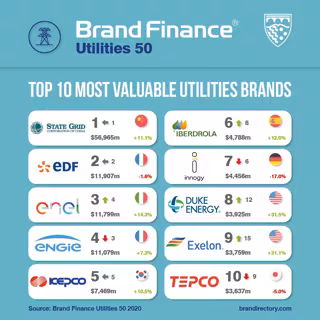 Por países, Estados Unidos domina el ranking 'Brand Finance Utilities 50 2020' con 20 marcas, mientras que las compañías alemanas se tambalean con tres de las caídas más fuertes del ranking.