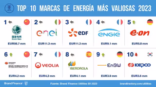 En el ranking general, la china State Grid, por delante de la italiana Enel y la francesa EDF, es la marca de energía más fuerte y valiosa del mundo, con un valor de 58.700 millones de dólares. Tiene además el valor y la puntuación más altos en Percepción de Sostenibilidad.