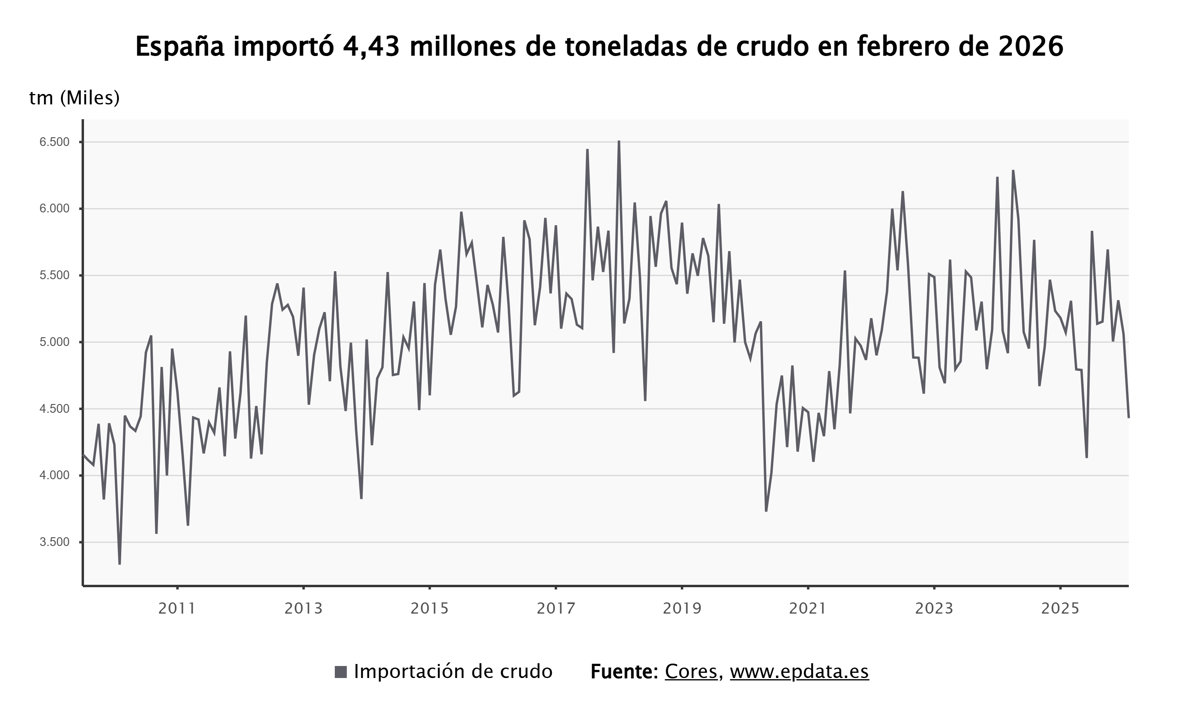 En concreto, el crudo que llegó a España en el segundo mes de 2026, antes prácticamente del inicio del conflicto bélico en Irán que estalló tras el ataque de Israel y Estados Unidos el 28 de febrero, con origen de Oriente Medio ascendió a 751.000 toneladas.