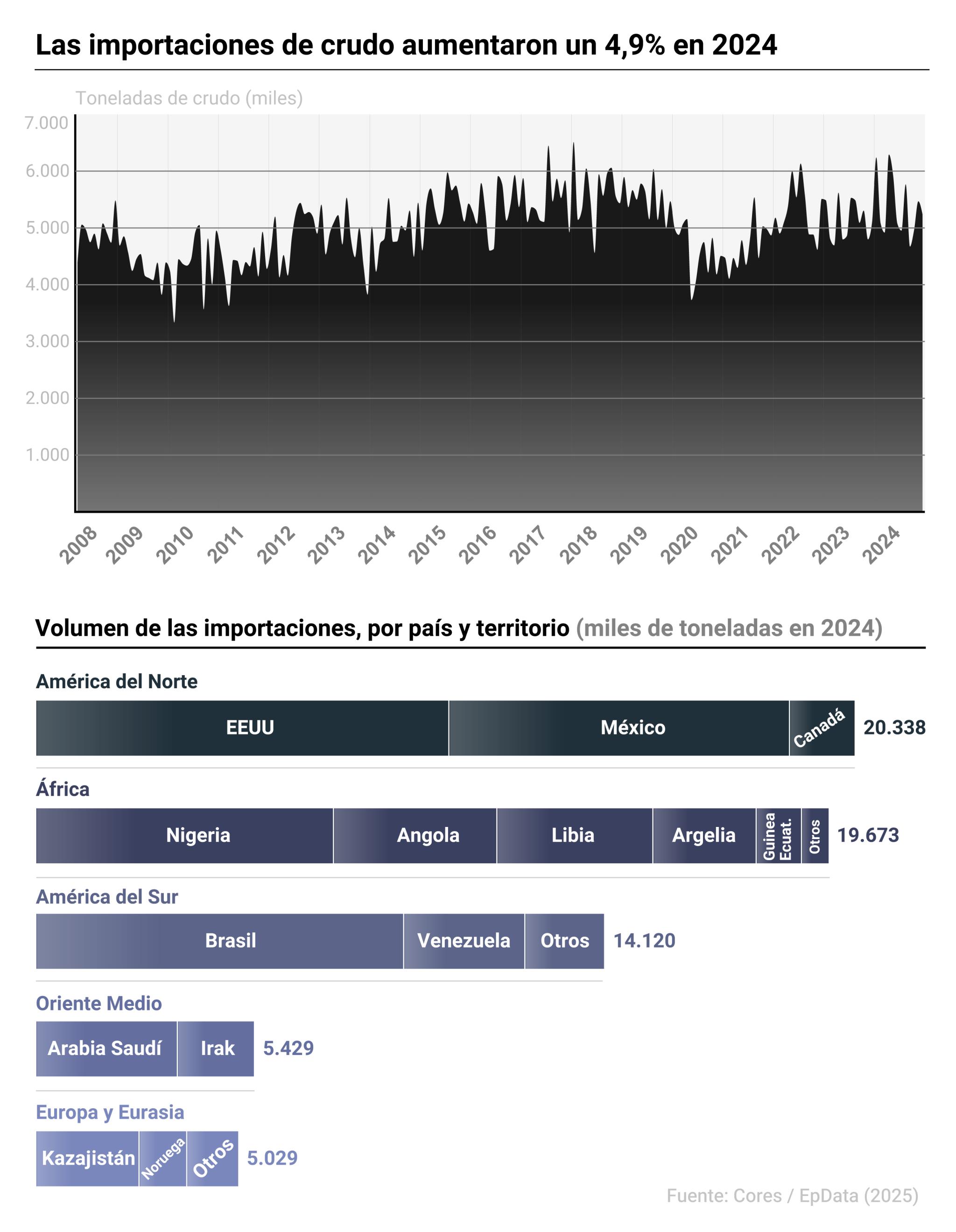 Con estas cifras el país sudamericano copó el 4,7% del crudo importado a España a lo largo de 2024, siendo el octavo principal suministrador.