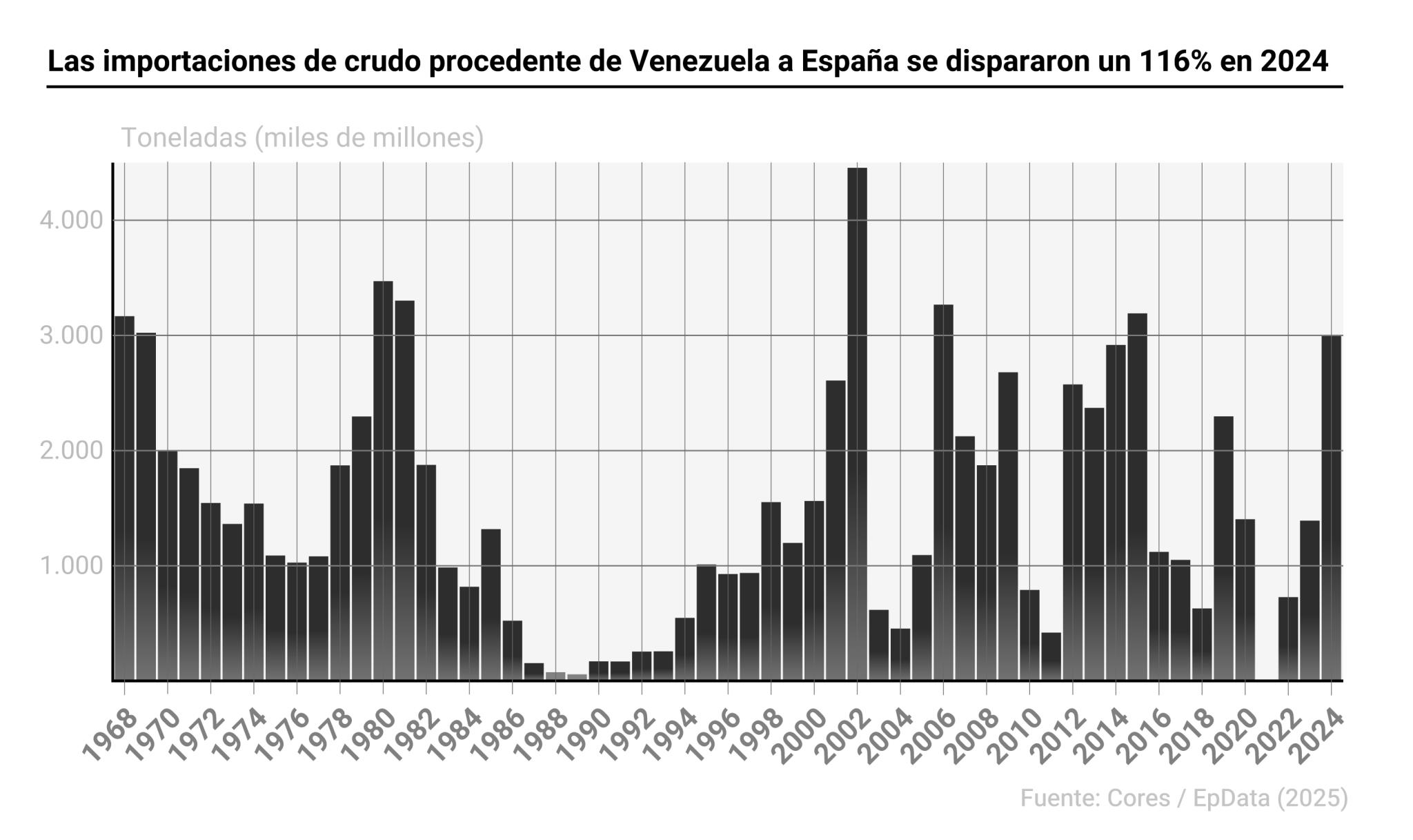 Las importaciones de crudo procedente de Venezuela a España se dispararon en 2024 un 116,1% con respecto al año anterior, superando los tres millones de toneladas, según los datos a cierre de año de la Corporación de Reservas Estratégicas de Productos Petrolíferos (Cores).
