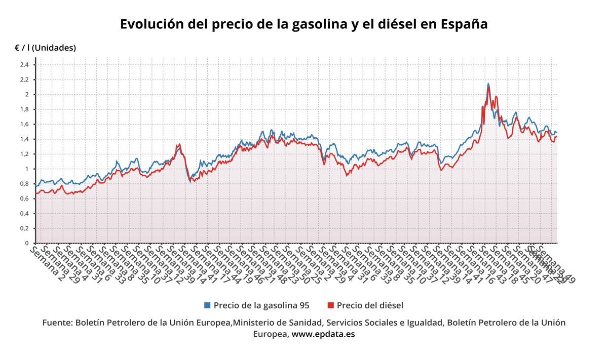Asimismo, ambos carburantes continúan lejos de los máximos que registraron el verano de 2022, en julio, cuando la gasolina alcanzó los 2,141 euros y el gasóleo los 2,1 euros.