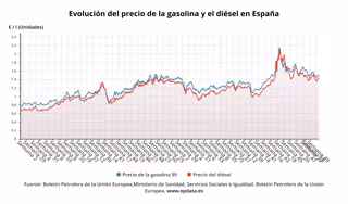 El precio medio del litro del diésel se mantiene claramente por debajo de los niveles en que estaba antes del estallido de la invasión rusa de Ucrania, que comenzó el 24 de febrero de 2022, cuando era de 1,479 euros el litro. La gasolina, mientras, sigue también por debajo del precio de los 1,591 euros el litro que tenía en ese momento.