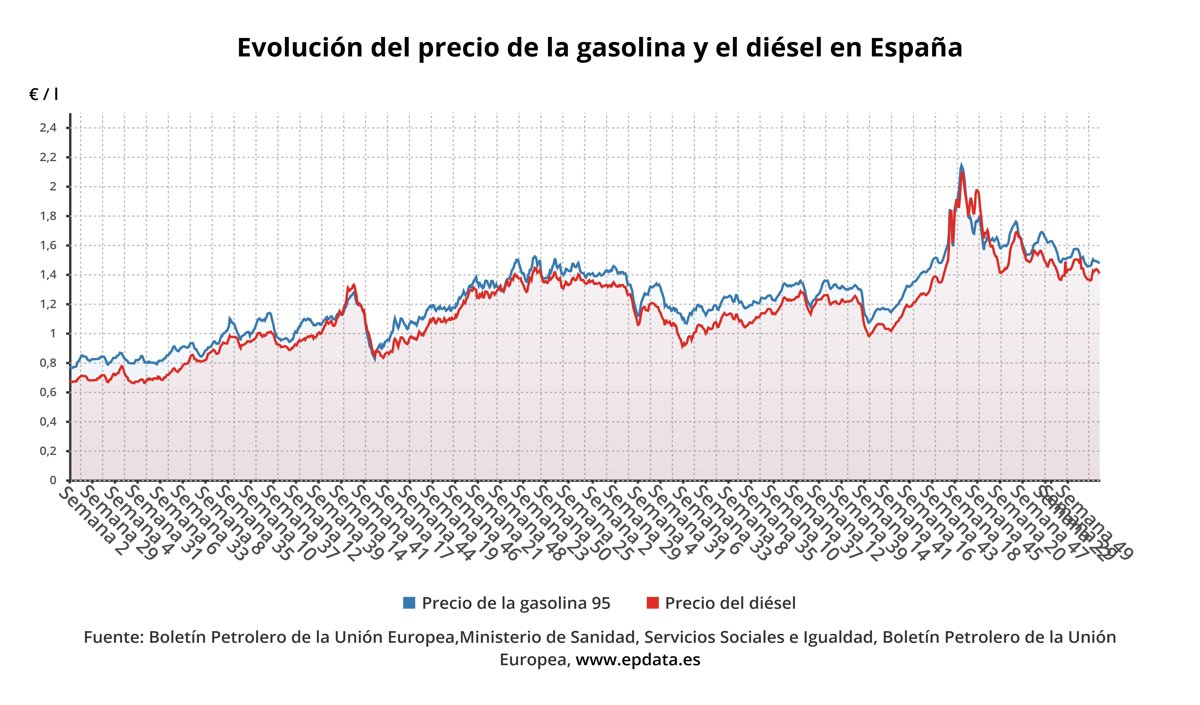 Asimismo, ambos carburantes continúan lejos de los máximos que registraron el verano de 2022, en julio, cuando la gasolina alcanzó los 2,141 euros y el gasóleo los 2,1 euros.