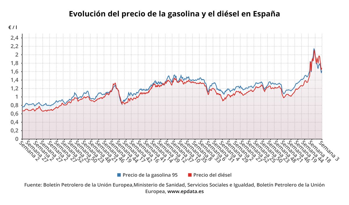 No obstante, con estos niveles de precio ambos carburantes se mantienen lejos de los máximos que tocaron el pasado verano, cuando en julio la gasolina alcanzó los 2,141 euros y el gasóleo los 2,1 euros.