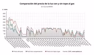 A este precio medio del 'pool' se sumaría la compensación a las gasistas, que tiene que ser abonada por los consumidores beneficiarios de la medida, los consumidores de la tarifa regulada (PVPC) o los que, a pesar de estar en el mercado libre, tienen una tarifa indexada, pero para este jueves se situará nuevamente en 0 euros/MWh, situación que se repite desde el pasado 27 de febrero.