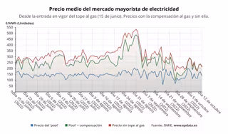 En concreto, si no se aplicara este mecanismo para topar el precio del gas para la generación de electricidad, el precio de la electricidad en España sería de media unos 215,72 euros/MWh, lo que supone 4,35 euros/MWh más que con la compensación para los clientes de la tarifa regulada, que pagarán así un 2% menos de media.