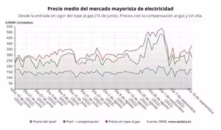 Evolución del precio de la luz con y sin compensación al gas - EPDATA