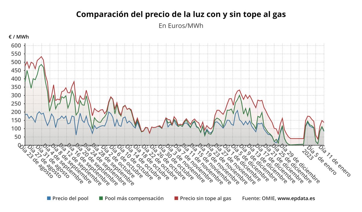 A este precio del 'pool' se suma la compensación a las gasistas, que tiene que ser abonada por los consumidores beneficiarios de la medida, los consumidores de la tarifa regulada (PVPC) o los que, a pesar de estar en el mercado libre, tienen una tarifa indexada, que para este miércoles se sitúa en 1,89 euros/MWh.