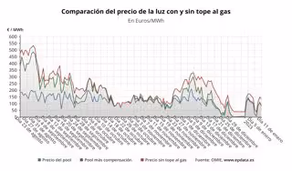 En ausencia del mecanismo de la 'excepción ibérica' para topar el precio del gas para la generación de electricidad, el precio de la luz en España sería de media de unos 128,22 euros/MWh, lo que supone 42,49 euros/MWh más que con la compensación para los clientes de la tarifa regulada, que pagarán así un 33,14% menos de media.