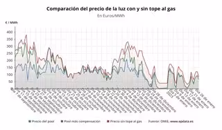 En ausencia del mecanismo de la 'excepción ibérica' para topar el precio del gas para la generación de electricidad, el precio de la luz en España sería de media de unos 83,58 euros/MWh, lo que supone 16,69 euros/MWh más que con la compensación para los clientes de la tarifa regulada, que pagarán así un 19,97% menos de media.