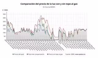 A este precio del 'pool' se suma la compensación a las gasistas, que tiene que ser abonada por los consumidores beneficiarios de la medida, los consumidores de la tarifa regulada (PVPC) o los que, a pesar de estar en el mercado libre, tienen una tarifa indexada, que para este miércoles se situará por cuarto día consecutivo en 0 euros/MWh.