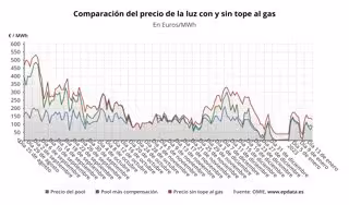 En ausencia del mecanismo de la 'excepción ibérica' para topar el precio del gas para la generación de electricidad, el precio de la luz en España sería de media de unos 121,15 euros/MWh, lo que supone 31,65 euros/MWh más que con la compensación para los clientes de la tarifa regulada, que pagarán así un 26,13% menos de media.