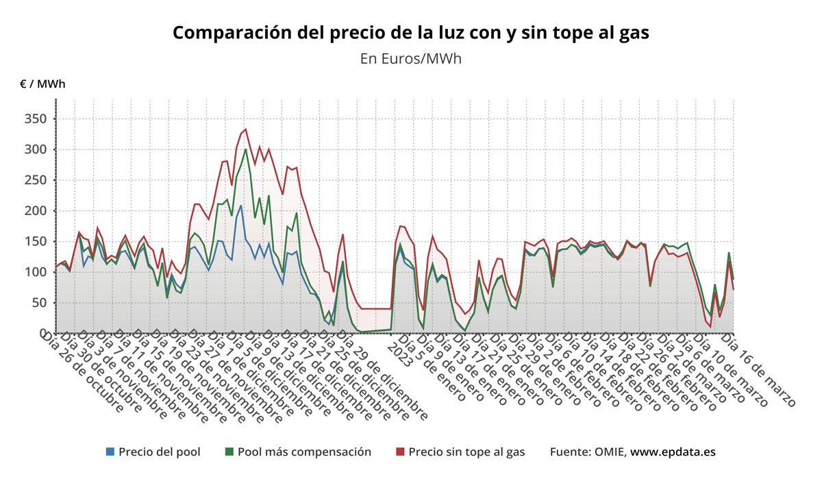 A este precio del 'pool' se suma la compensación a las gasistas, que tiene que ser abonada por los consumidores beneficiarios de la medida, los consumidores de la tarifa regulada (PVPC) o los que, a pesar de estar en el mercado libre, tienen una tarifa indexada, que para este jueves se situará en 0 euros/MWh, situación que se repite desde el pasado 27 de febrero.