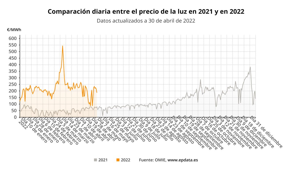 Respecto a hace un año, el precio medio de la electricidad para este sábado será un 135,15% más caro que los 79,29 euros/MWh del 30 de abril de 2021.