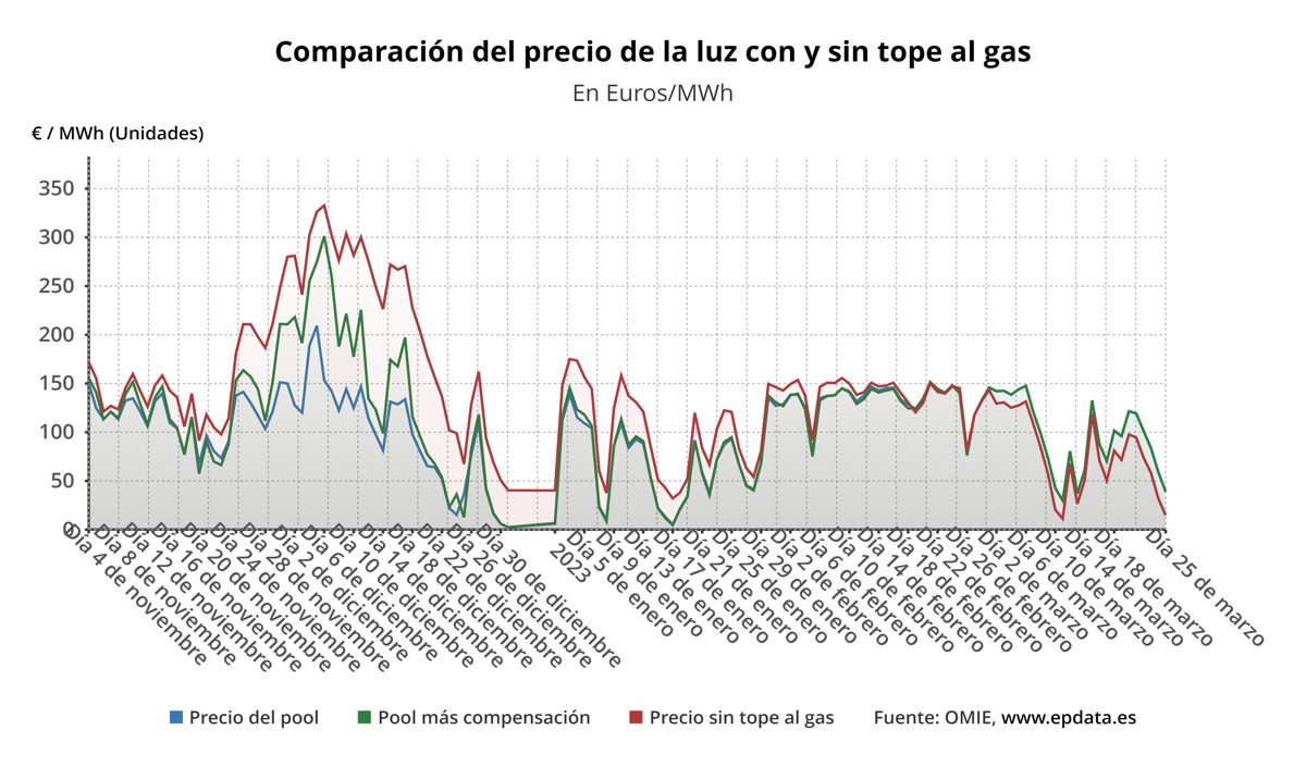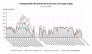 A este precio del 'pool' se suma la compensación a las gasistas, que tiene que ser abonada por los consumidores beneficiarios de la medida, los consumidores de la tarifa regulada (PVPC) o los que, a pesar de estar en el mercado libre, tienen una tarifa indexada, que para este sábado se situará en 0 euros/MWh, situación que se repite desde el pasado 27 de febrero.