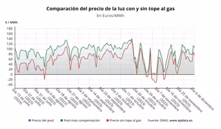 En estos seis primeros días de diciembre, el precio medio del 'pool' eléctrico es de 92,54 euros/MWh, ligeramente inferior a los 96,95 euros/MWh que marcó de media para el mismo mes del año pasado.