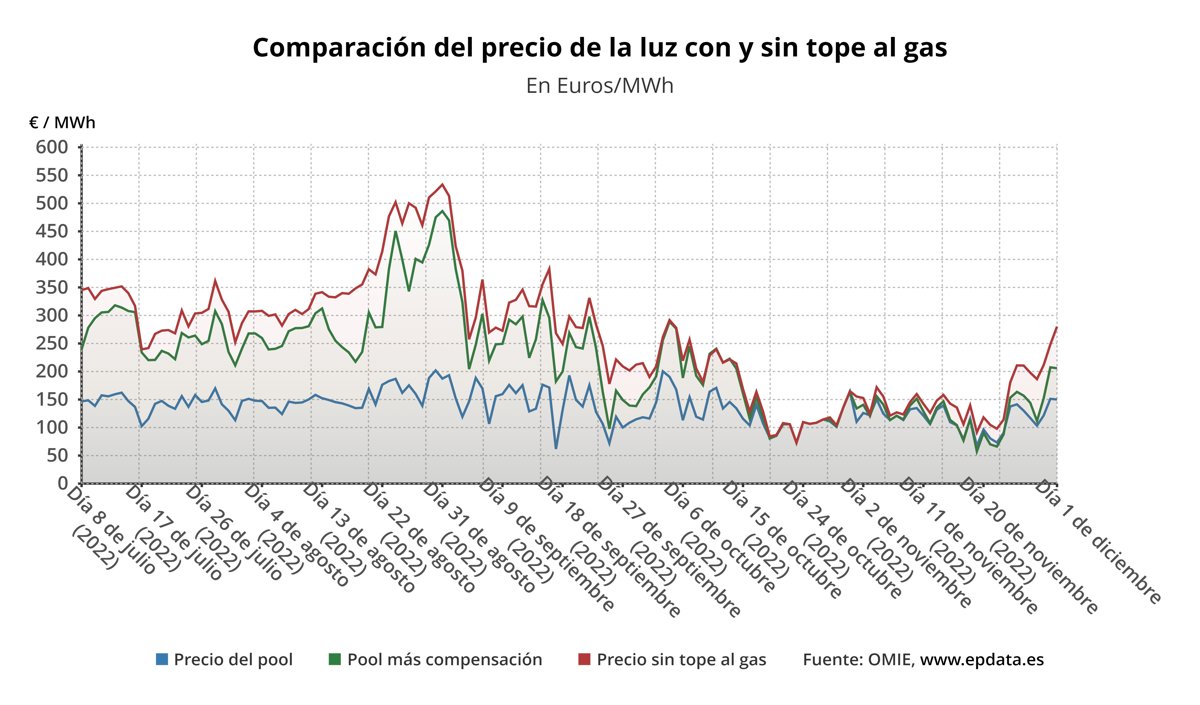 En ausencia del mecanismo de la 'excepción ibérica' para topar el precio del gas para la generación de electricidad, el precio de la electricidad en España sería de media unos 280,06 euros/MWh, lo que supone unos 74,2 euros/MWh más que con la compensación para los clientes de la tarifa regulada, que pagarán así un 26,5% menos de media.