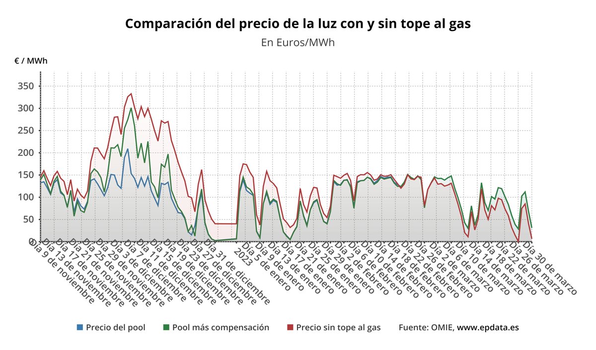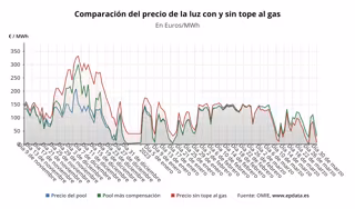 A este precio del 'pool' se sumaría la compensación a las gasistas, que tiene que ser abonada por los consumidores beneficiarios de la medida, los consumidores de la tarifa regulada (PVPC) o los que, a pesar de estar en el mercado libre, tienen una tarifa indexada, pero para este jueves se situará nuevamente en 0 euros/MWh, situación que se repite desde el pasado 27 de febrero.