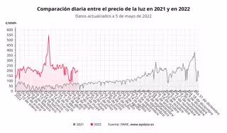 Comparación diaria del precio de la luz entre 2021 y 2022 - EPDATA