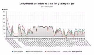 A este precio medio del 'pool' se sumaría la compensación a las gasistas, que tiene que ser abonada por los consumidores beneficiarios de la medida, los consumidores de la tarifa regulada (PVPC) o los que, a pesar de estar en el mercado libre, tienen una tarifa indexada, pero para este sábado se situará nuevamente en 0 euros/MWh, situación que se repite desde el pasado 27 de febrero.