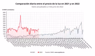 Comparación diaria del precio de la luz entre 2021 y 2022 (OMIE) - EPDATA