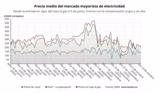 En concreto, si no se aplicara este mecanismo para topar el precio del gas para la generación de electricidad, el precio de la electricidad en España sería de media unos 214,31 euros/MWh, lo que supone 10,11 euros/MWh más que con la compensación para los clientes de la tarifa regulada, que pagarán así un 4,7%% menos de media.