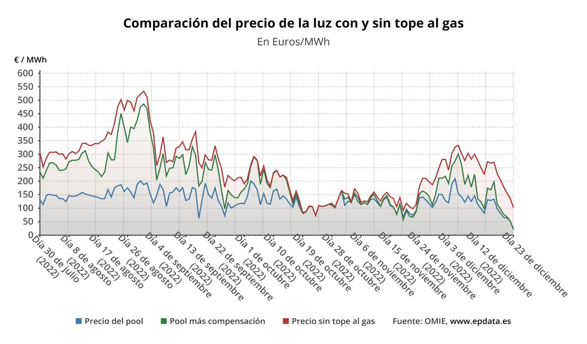 En ausencia del mecanismo de la 'excepción ibérica' para topar el precio del gas para la generación de electricidad, el precio de la electricidad en España sería de media unos 102,07 euros/MWh, lo que supone unos 80,95 euros/MWh más que con la compensación para los clientes de la tarifa regulada, que pagarán así un 79,3% menos de media.