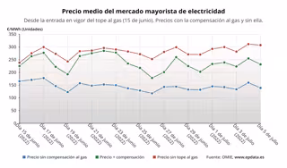 En ausencia del mecanismo de la 'excepción ibérica' para topar el precio del gas para la generación de electricidad, el precio de la electricidad en España habría sido de media unos 307,41 euros/MWh, lo que supone unos 63,49 euros/MWh más que con la compensación para los clientes de la tarifa regulada, que pagarán así en torno a un 24,62% menos de media.