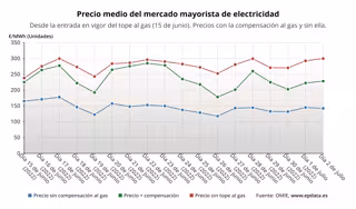 En ausencia del mecanismo de la 'excepción ibérica' para topar el precio del gas para la generación de electricidad, el precio de la electricidad en España habría sido de media unos 299,75 euros/MWh, lo que supone unos 71 euros/MWh más que con la compensación para los clientes de la tarifa regulada, que pagarán así en torno a un 23,79% menos de media.