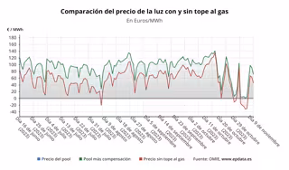 En lo que va de noviembre, el 'pool' registra un precio medio de 37,4 euros/MWh, frente a los algo más de 115 euros/MWh que registró en el mismo mes del año pasado.