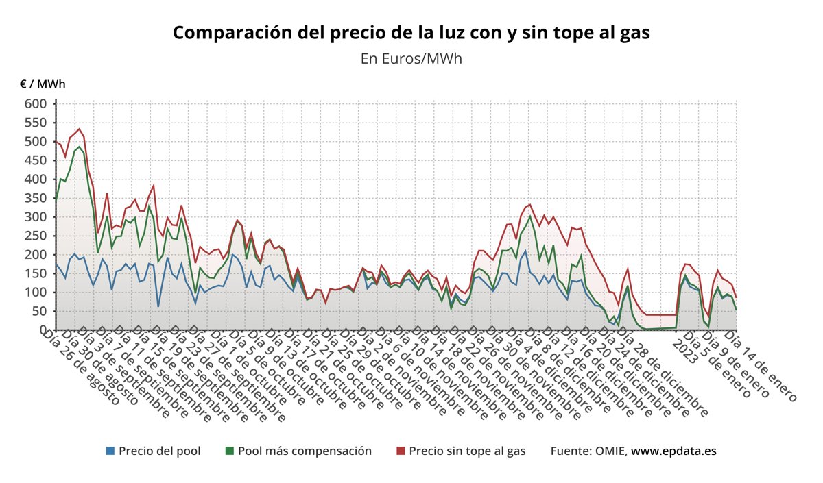 En ausencia del mecanismo de la 'excepción ibérica' para topar el precio del gas para la generación de electricidad, el precio de la luz en España sería de media de unos 85,38 euros/MWh, lo que supone 32,19 euros/MWh más que con la compensación para los clientes de la tarifa regulada, que pagarán así un 37,7% menos de media.