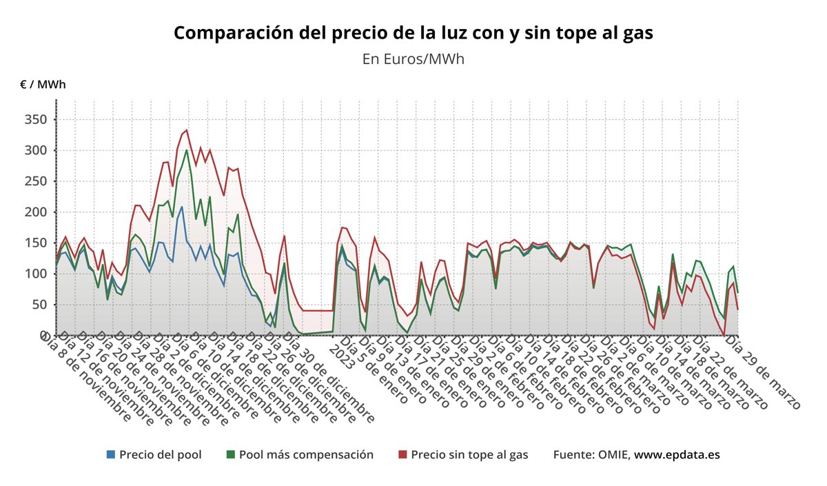 A este precio del 'pool' se suma la compensación a las gasistas, que tiene que ser abonada por los consumidores beneficiarios de la medida, los consumidores de la tarifa regulada (PVPC) o los que, a pesar de estar en el mercado libre, tienen una tarifa indexada, que para este miércoles se situará en 0 euros/MWh, situación que se repite desde el pasado 27 de febrero.