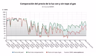A este precio medio del 'pool' se sumaría la compensación a las gasistas, que tiene que ser abonada por los consumidores beneficiarios de la medida, los consumidores de la tarifa regulada (PVPC) o los que, a pesar de estar en el mercado libre, tienen una tarifa indexada, pero que se sitúa nuevamente en 0 euros/MWh, situación que se repite desde el pasado 27 de febrero.