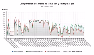 A este precio medio del 'pool' se sumaría la compensación a las gasistas, que tiene que ser abonada por los consumidores beneficiarios de la medida, los consumidores de la tarifa regulada (PVPC) o los que, a pesar de estar en el mercado libre, tienen una tarifa indexada, pero para este sábado se situará nuevamente en 0 euros/MWh, situación que se repite desde el pasado 27 de febrero.
