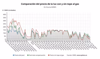 A este precio medio del 'pool' se sumaría la compensación a las gasistas, que tiene que ser abonada por los consumidores beneficiarios de la medida, los consumidores de la tarifa regulada (PVPC) o los que, a pesar de estar en el mercado libre, tienen una tarifa indexada, pero para este sábado se situará nuevamente en 0 euros/MWh, situación que se repite desde el pasado 27 de febrero.