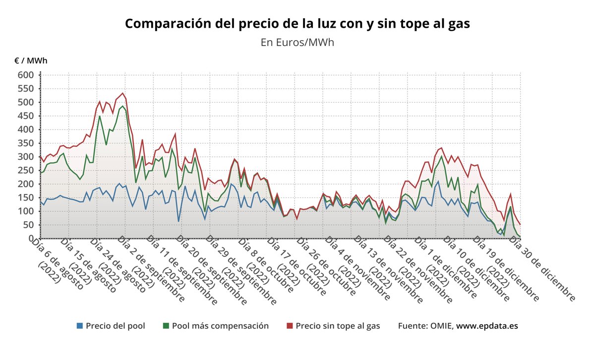 En ausencia del mecanismo de la 'excepción ibérica' para topar el precio del gas para la generación de electricidad, el precio de la luz en España sería de media de unos 50,53 euros/MWh, lo que supone unos 45,06 euros/MWh más que con la compensación para los clientes de la tarifa regulada, que pagarán así un 89,17% menos de media.
