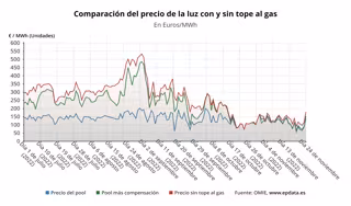 En ausencia del mecanismo de la 'excepción ibérica' para topar el precio del gas para la generación de electricidad, el precio de la electricidad en España sería de media unos 180,67 euros/MWh, lo que supone unos 28,5 euros/MWh más que con la compensación para los clientes de la tarifa regulada, que pagarán así un 15,8% menos de media.