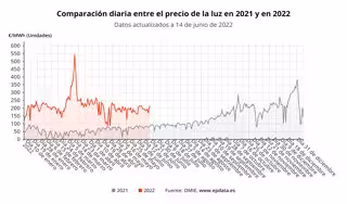 Comparación diaria del precio de la luz entre 2021 y 2022 - EPDATA