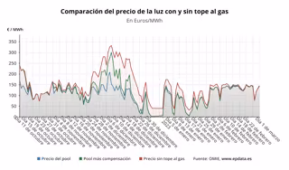 A este precio del 'pool' se suma la compensación a las gasistas, que tiene que ser abonada por los consumidores beneficiarios de la medida, los consumidores de la tarifa regulada (PVPC) o los que, a pesar de estar en el mercado libre, tienen una tarifa indexada, que para este miércoles se situará en 0 euros/MWh.
