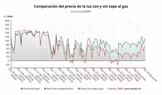 A este precio medio del 'pool' se sumaría la compensación a las gasistas, que tiene que ser abonada por los consumidores beneficiarios de la medida, los consumidores de la tarifa regulada (PVPC) o los que, a pesar de estar en el mercado libre, tienen una tarifa indexada, pero que se sitúa nuevamente en 0 euros/MWh, situación que se repite desde el pasado 27 de febrero.