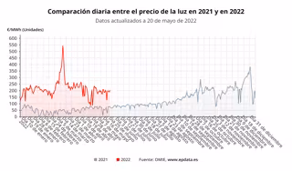 Comparación diaria del precio de la luz entre 2021 y 2022 - EPDATA