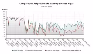 A este precio medio del 'pool' se sumaría la compensación a las gasistas, que tiene que ser abonada por los consumidores beneficiarios de la medida, los consumidores de la tarifa regulada (PVPC) o los que, a pesar de estar en el mercado libre, tienen una tarifa indexada, pero que se sitúa nuevamente en 0 euros/MWh, situación que se repite desde el pasado 27 de febrero.
