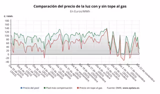 En lo que va de mes de noviembre, el 'pool' eléctrico registra un precio medio en torno a los 53 euros/MWh, frente a los 115 euros/MWh de media en el mismo mes del año pasado.