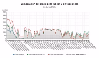 A este precio medio del 'pool' se sumaría la compensación a las gasistas, que tiene que ser abonada por los consumidores beneficiarios de la medida, los consumidores de la tarifa regulada (PVPC) o los que, a pesar de estar en el mercado libre, tienen una tarifa indexada, pero para este jueves se situará nuevamente en 0 euros/MWh, situación que se repite desde el pasado 27 de febrero.