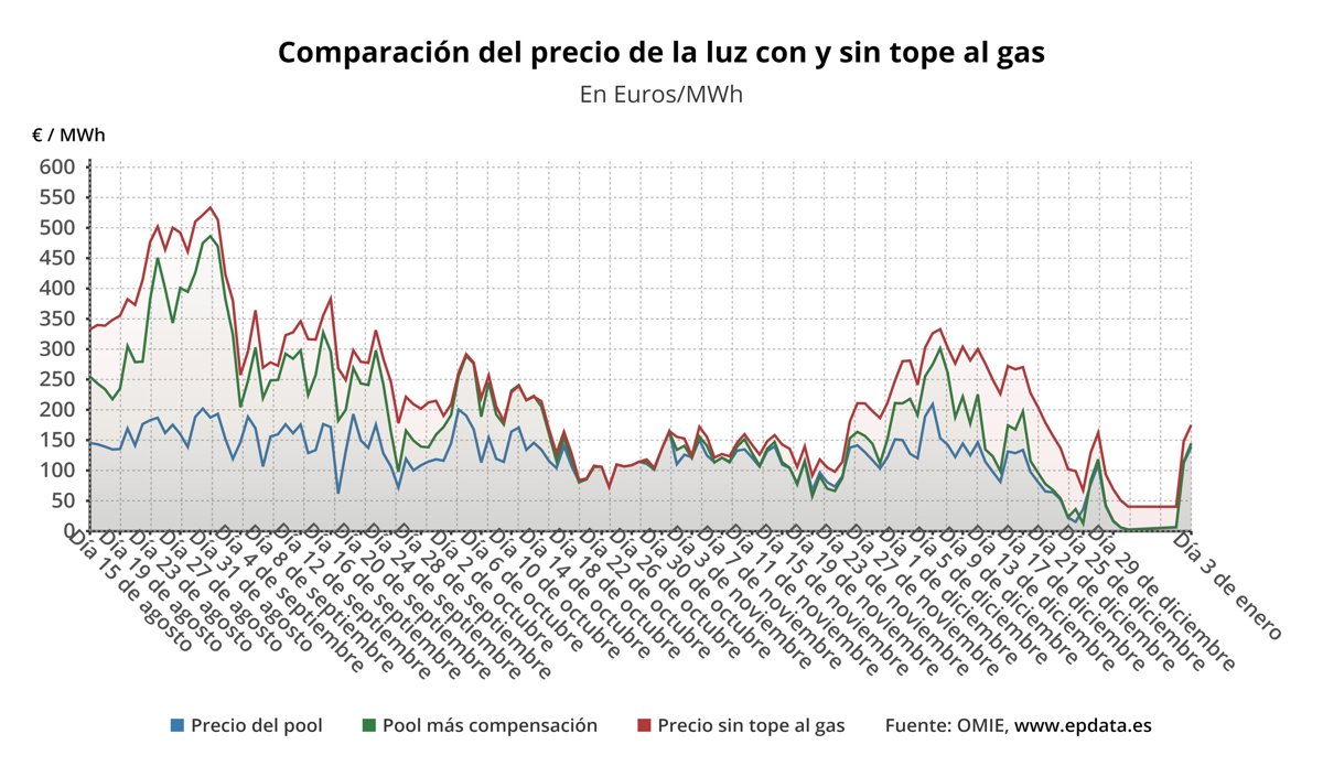 En ausencia del mecanismo de la 'excepción ibérica' para topar el precio del gas para la generación de electricidad, el precio de la luz en España sería de media de unos 175,12 euros/MWh, lo que supone unos 30 euros/MWh más que con la compensación para los clientes de la tarifa regulada, que pagarán así un 17% menos de media.